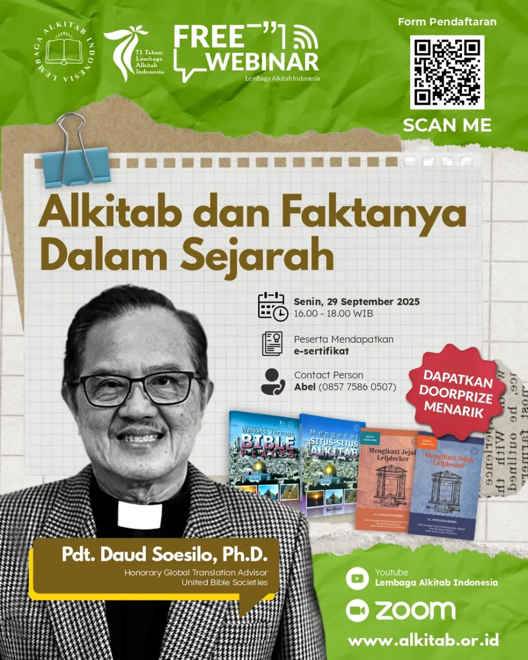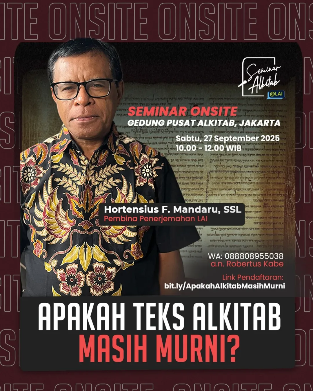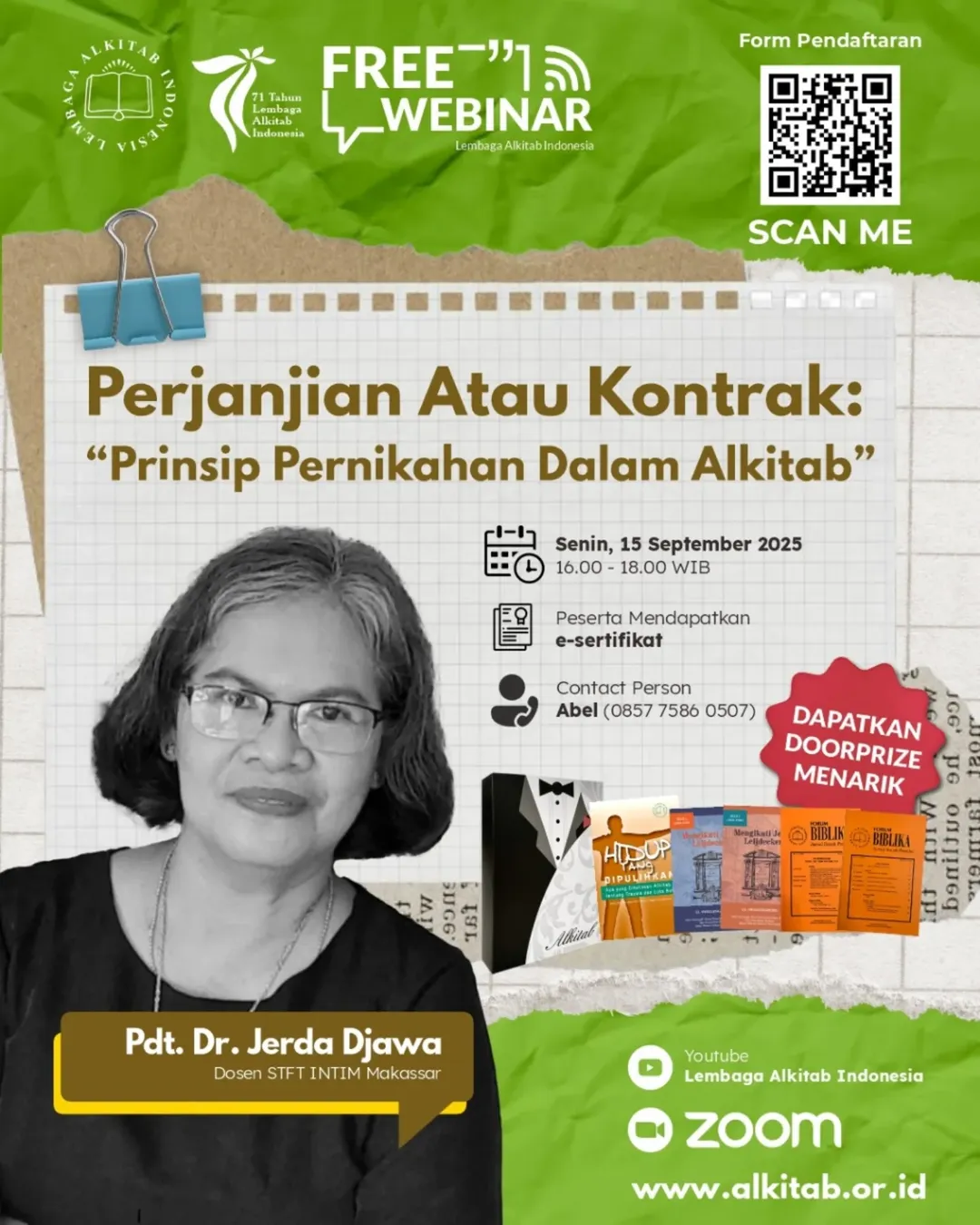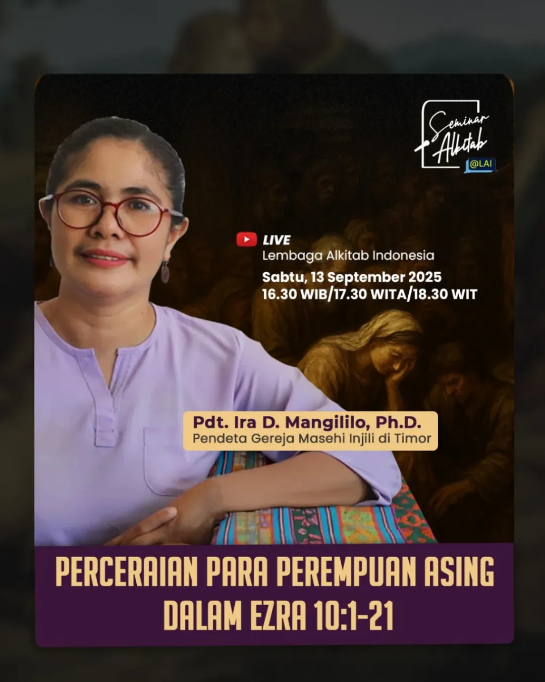 JADWAL ACARA LAI < September 2025 > SeninSelasaRabuKamisJumatSabtuMinggu 1 2 3 4Rakyat Melawan - Bincang AlkitabRakyat Melawan - Bincang AlkitabTime: 2:00 pm - 3:30 pmRakyat mengangkat para pemimpin bukan untuk menjadi tuan, apalagi tuan yang sewenang-wenang atas mereka. Seorang pemimpin harus mendengarkan, melayani dan memperhatikan rakyatnya. Sebab kalau tidak, rakyat akan melawan. Mungkin tidak saat ini, tetapi nanti ketika waktunya telah tiba; mungkin dulu tidak, tetapi sekarang iya, karena waktunya telah tiba. Inilah yang kita lihat dalam beberapa hari terakhir di negara kita ini; rakyat jengah dengan para pemimpin yang hanya sibuk dengan kesenangan sendiri, dan akhirnya melawan. Dalam Alkitab, rakyat Israel pernah melakukannya dengan raja mereka, Rehabeam. Sehingga terjadilah yang seperti ini: Setelah seluruh Israel melihat bahwa raja tidak mendengarkan mereka, rakyat menjawab raja, "Bagian apa yang kita dapat dari Daud? Kita tidak mewarisi apa-apa dari anak Isai itu! Ke kemahmu, hai orang Israel! Sekarang uruslah rumahmu sendiri, hai Daud!” (1Raj. 12:16) 5 6Alkitab dan Ekosida - Seminar AlkitabAlkitab dan Ekosida - Seminar AlkitabTime: 4:30 pm - 5:30 pmMenaklukkan dan Menguasai Alam, Benarkah itu Perintah Tuhan? Krisis lingkungan global menimbulkan pertanyaan serius: apa peran iman dan ajaran agama dalam membentuk hubungan manusia dengan alam? Teks seperti “Beranakcuculah dan bertambah banyaklah. Penuhilah dan taklukkanlah bumi. Berkuasalah atas ikan-ikan di laut, burung-burung di udara, dan atas segala binatang melata di bumi” (Kej. 1:28) kerap dibaca secara sepihak dan antroposentris. Karena dipandang sebagai Imago Dei(Kej. 1:26), manusia merasa berhak menguasai dan mengeksploitasi alam demi kepentingannya sendiri. Akibatnya, Alkitab sering dituding sebagai sumber legitimasi atas kerusakan ekologis. Namun, benarkah itu maksud Tuhan? Bagaimana seharusnya teks-teks yang dianggap anti-ekologis ( grey texts ) ditafsirkan agar Alkitab tidak hanya menjadi Kitab Suci, tapi juga Kitab Hijau ( Green Bible ) yang menuntun pada relasi harmonis dengan ciptaan? 7 8 9 10 11 12 13Perceraian Para Perempuan Asing dalam Ezra 10:1-21Perceraian Para Perempuan Asing dalam Ezra 10:1-21Time: 4:00 pm - 6:00 pmSeminar Alkitab Ezra 10:1–21 mencerminkan salah satu momen penting dalam sejarah pembentukan kembali identitas bangsa Israel pasca pembuangan. Dalam konteks kembalinya bangsa Israel dari pembuangan di Babel, terjadi percampuran budaya dan keyakinan melalui praktik perkawinan campuran antara laki-laki Israel dan perempuan dari bangsa asing. Praktik ini dipandang sebagai pelanggaran terhadap hukum Tuhan, khususnya dalam hal menjaga kekudusan umat perjanjian. Ezra memimpin bangsa Israel dalam suatu pertobatan kolektif yang diwujudkan melalui tindakan drastis berupa perceraian massal dari perempuan asing. Langkah ini bukan sekadar tindakan sosial, melainkan dimaknai secara teologis sebagai bentuk pemurnian dan pemulihan kesetiaan umat kepada Allah. Perceraian tersebut dipandang sebagai pengorbanan yang harus dilakukan demi menegakkan kembali perjanjian yang telah dilanggar dan memulihkan kekudusan komunitas Israel sebagai umat pilihan. 14 15Perjanjian atau Kontrak: Prinsip Pernikahan dalam AlkitabPerjanjian atau Kontrak: Prinsip Pernikahan dalam AlkitabTime: 4:00 pm - 6:00 pmFree Webinar Pernikahan merupakan sebuah ikatan sakral yang bersifat sekali seumur hidup. Namun seiring berkembangnya zaman, arti pernikahan itu bergeser. Tak sedikit yang menganggap pernikahan merupakan ikatan hukum atau kesepakatan sosial. Padahal lebih dari itu, pernikahan merupakan ikatan sakral dengan Tuhan sebagai salah satu saksinya. Pemahaman yang keliru ini menimbulkan banyak persoalan dalam rumah tangga, mulai dari kurangnya komitmen, hingga hilangnya tujuan ilahi dalam membangun keluarga. Oleh karena itu, penting bagi setiap pasangan untuk mempersiapkan diri serta kembali memahami prinsip perjanjian dalam pernikahan menurut Firman Tuhan, agar tidak hanya bertahan secara legal, tetapi juga selaras dengan kehendak Allah. 16 17 18Dari Ekonomi Transaksional ke Ekonomi PembebasanDari Ekonomi Transaksional ke Ekonomi PembebasanTime: 2:00 pm - 3:30 pmdalam II Raja-raja 4:1-7 | Lady Mandalika (Bincang Alkitab) Dalam kitab Raja-raja kita membaca nama-nama para raja Israel dan Yehuda dengan berbagai kisah menarik dalam kepemimpinan mereka. Kisah-kisah itu memang memperlihatkan bagaimana kisah kehidupan para raja tetapi juga bagaimana kuasa Allah yang membebaskan dekat dengan kehidupan manusia bahkan mengintervensi kuasa maut yang dihadirkan para raja. Di tengah kisah para raja-raja, dalam kitab tersebut kita juga menemukan kisah dan peran para nabi yang diutus Tuhan yaitu Elia dan Elisa. Mereka diingat sebagai sosok yang dipenuhi dengan kuasa Ajaib yang mengagumkan bahkan sampai membangkitkan orang mati. Bincang Alkitab kali ini akan membahas salah satu kisah perjumpaan Elisa dengan seorang perempuan yang mengalami krisis ekonomi dan hampir kehilangan anaknya sebagai budak pembayaran hutang. Teks ini menjadi pintu masuk untuk mendiskusikan tentang peralihan ekonomi transaksional yang bersandar pada hutang dan transaksi ekonomi yang menekan menjadi ekonomi pembebasan yang digerakkan oleh kasih, keterlibatan, dan solidaritas. 19Tokoh Alkitab; Role Model Membangun Iman & KarakterTokoh Alkitab; Role Model Membangun Iman & KarakterTime: 4:00 pm - 6:00 pmFree Webinar Dalam era modern yang penuh dengan perkembangan teknologi, penyebaran informasi yang cepat, dan pertumbuhan budaya, anak anak menghadapi tantangan besar dalam menentukan identitas diri serta kepribadian mereka. Hal ini memaksa lingkungan tempat anak belajar dan bertumbuh untuk ikut ambil andil dalam pertumbuhan nilai serta karakter mereka. Orang tua dan tenaga pendidik dituntut menjadi panutan bagi anak dengan sikap serta pribadi yang dapat diteladani. Selain melihat teladan dalam kehidupan sehari hari, anak juga perlu memiliki panutan dalam pertumbuhan iman mereka